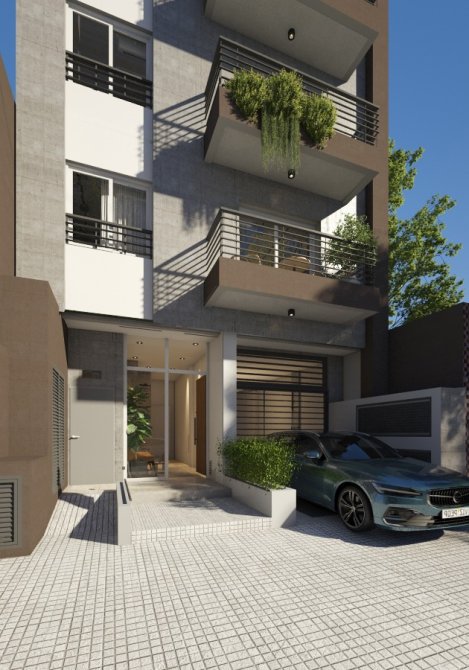 Edificio de calidad superior desarrollado en planta baja y 7 pisos, con unidades de 2 ambientes de 46 m², al frente y contrafrente.