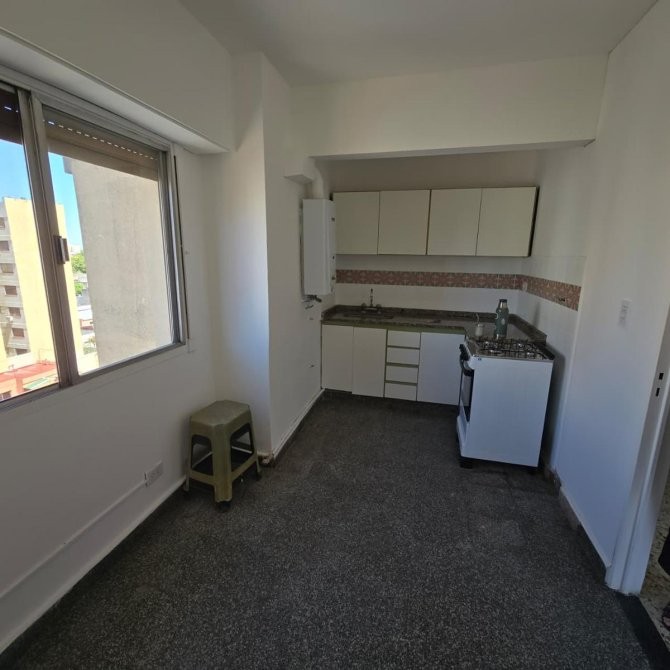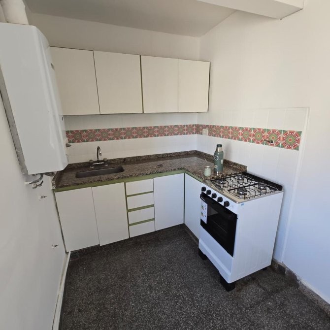 Cocina 2,30 x 4,35 piso granito alto y bajo mesada calefón ventana al frente.