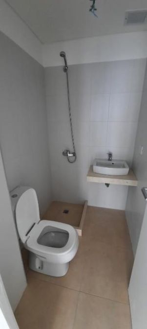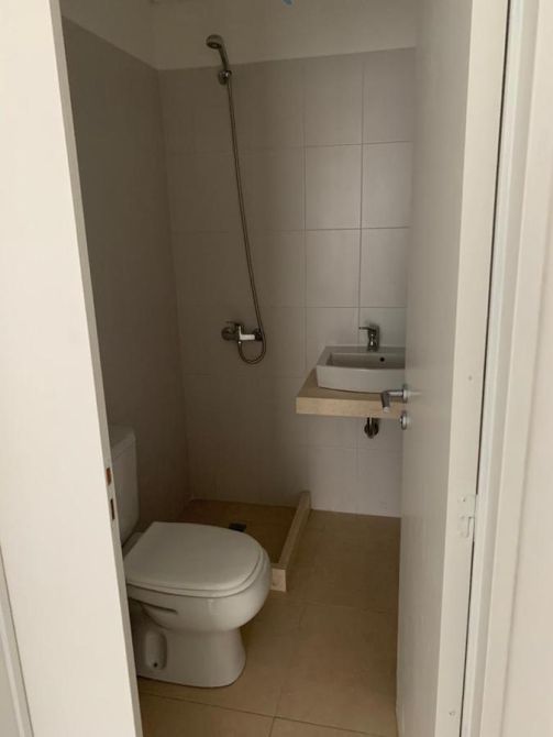 Cocina Americana con mueble bajo y sobre mesada, bacha simple de acero inoxidable y griferia mono comando, mesada de granito y anafe eléctrico. Baño completo con ducha.