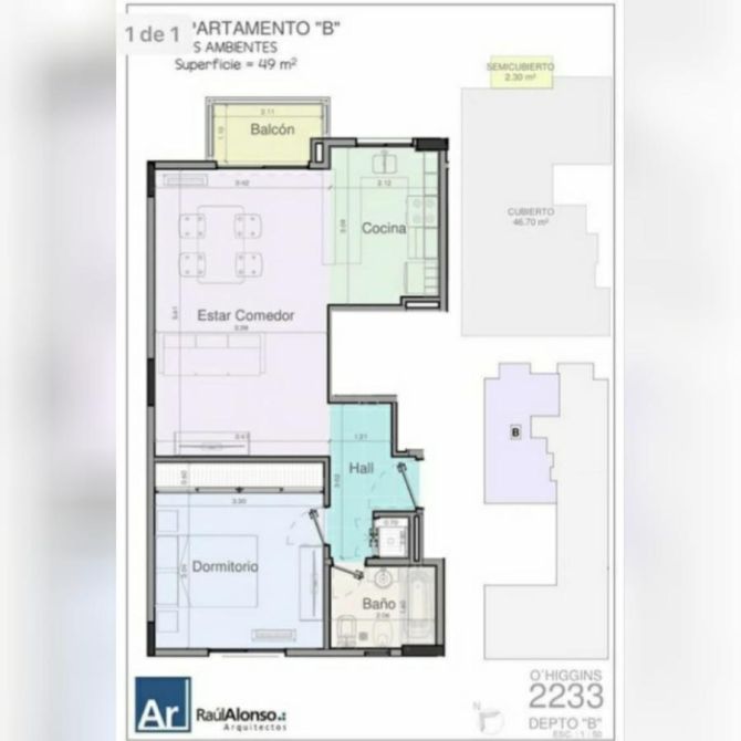 Departamento al contra frente de 56Mts2 totales, con cochera, compuesto de living comedor con cocina integrada y balcon, baño, lavadero, dormitorio con frente de placard.