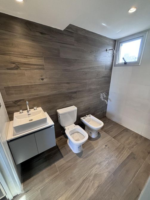 Pisos porcelanato simil madera, en todos los ambientes. Aberturas de aluminio anodizado.