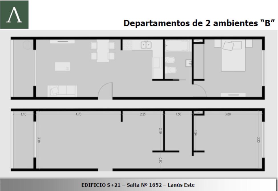 Contará con 49m2 distribuidos en living comedor con balcon al frente de 4.70 x 3.20 mts., cocina integrada de 2.25 x 2.20 mts., dormitorio al contra frente de 3.80 x 3.20 mts. y baño de 1.50 mts. x 2.20 mts.