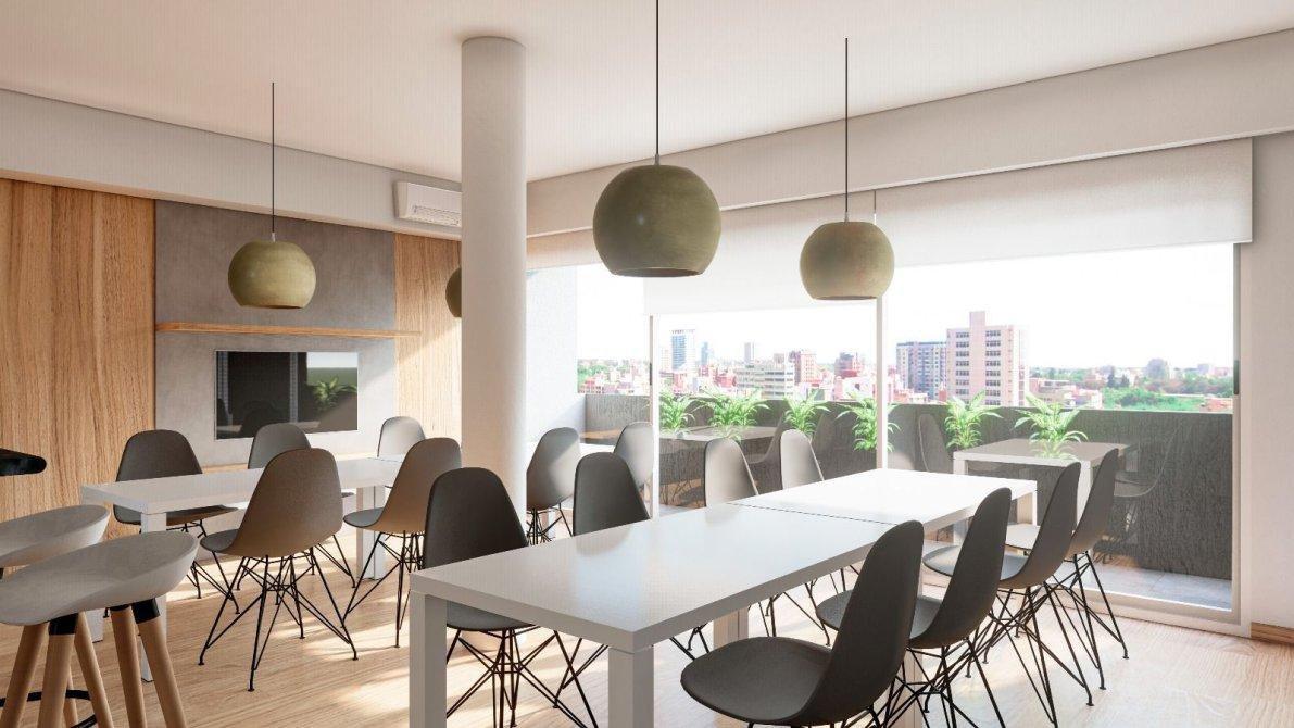 El edificio cuenta con: Hall doble altura vidriado con piso de porcelanato, ascensor monta-auto para cocheras, SUM con gimnasio y solarium, terraza accesibles de usos múltiples y detalles de categoría en fachada.