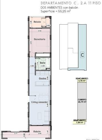 Departamento en construcción, que consta de living comedor con balcón al frente, cocina integrada, dormitorio al contra frente con balcón y baño.