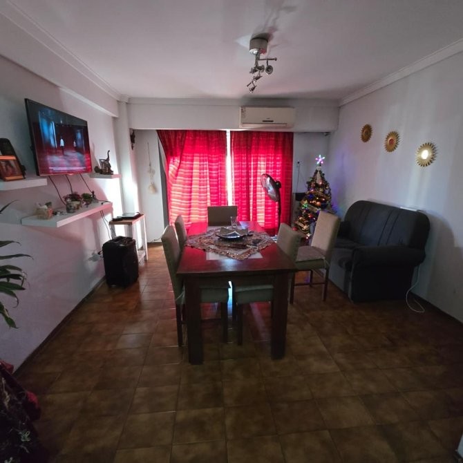 Living comedor: 3.80 x 4.40 m, piso cerámico, aire acondicionado, estufa tiro balanceado y salida al balcón.