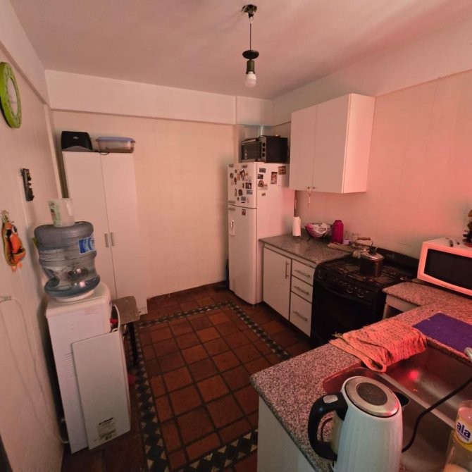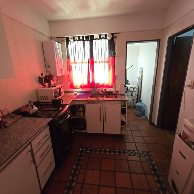 Cocina: 2.55 x 3.20 m, piso cerámico, muebles bajo y sobre mesada, calefón y ventana.