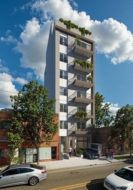Edificio de calidad superior desarrollado en planta baja y 7 pisos, con unidades de 2 ambientes de 46 m², al frente y contrafrente.